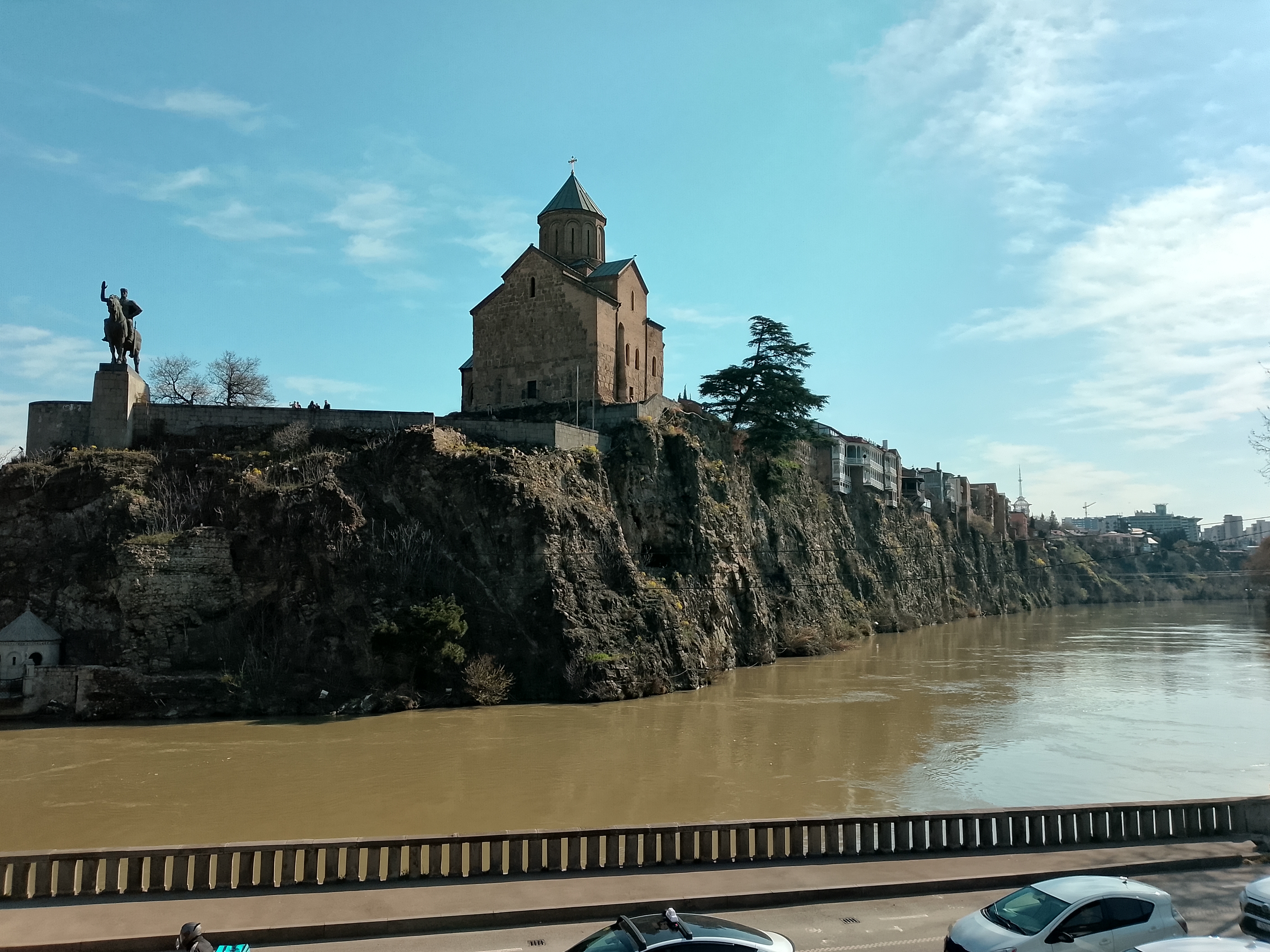 Near to the old town one of the river banks is formed by a very imposing cliff on top of which sat a large statue of a warrior on a horse and an old castle like building.