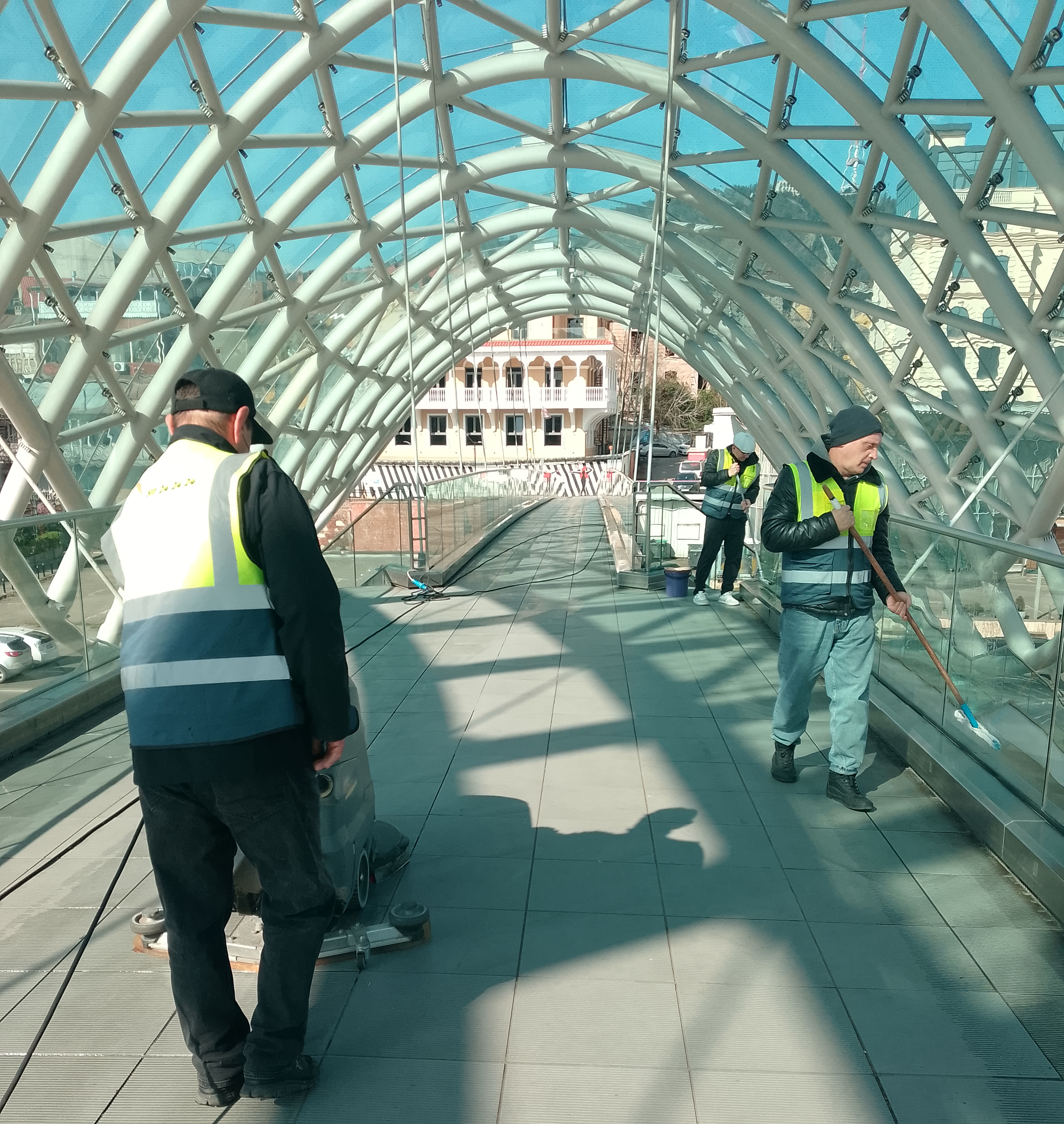 As I was crossing it I was pleasantly surprised to see the bridge getting its morning clean by city workers.